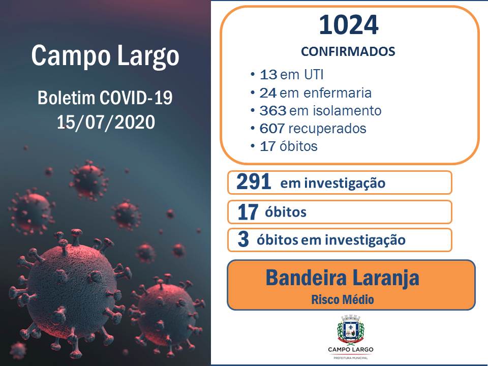 O Comitê de Prevenção ao Corona Vírus da Prefeitura Municipal de Campo Largo informa que com 35 novos casos, Campo Largo já ultrapassa 1000 moradores com resultado positivo para COVID-19. Os novos pacientes têm idades entre 4 e 60 anos, são 21 mulheres e 14 homens.