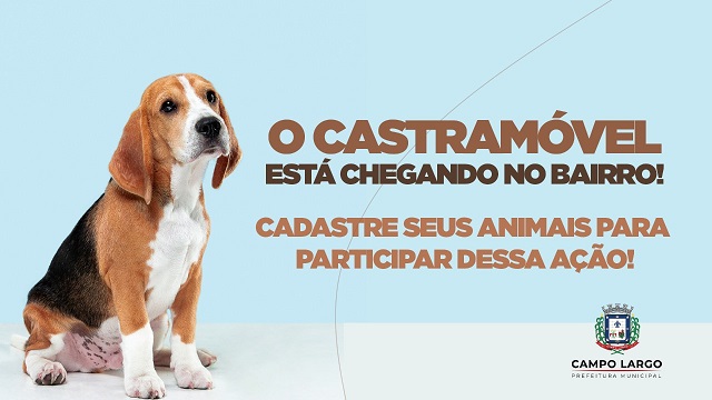 Com início no dia 11/04, está disponível o cadastramento para o Castramóvel, projeto de castração de cães e gatos que a Prefeitura de Campo Largo disponibiliza por meio da Secretaria Municipal de Saúde e da Secretaria Municipal de Meio Ambiente. O objetivo é castrar e microchipar, gratuitamente, os animais nos próximos meses, em diversas localidades do município, através de Unidade Móvel de Castração.