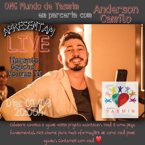 Neste sábado (01/08), com início às 20h, será realizada uma live, em prol da ONG campo-larguense “Mundo de Yasmin”. A live, que será transmitida através das redes sociais da ONG, vai trazer muita música gaúcha com Anderson Camilo e também um sorteio de prêmios.
