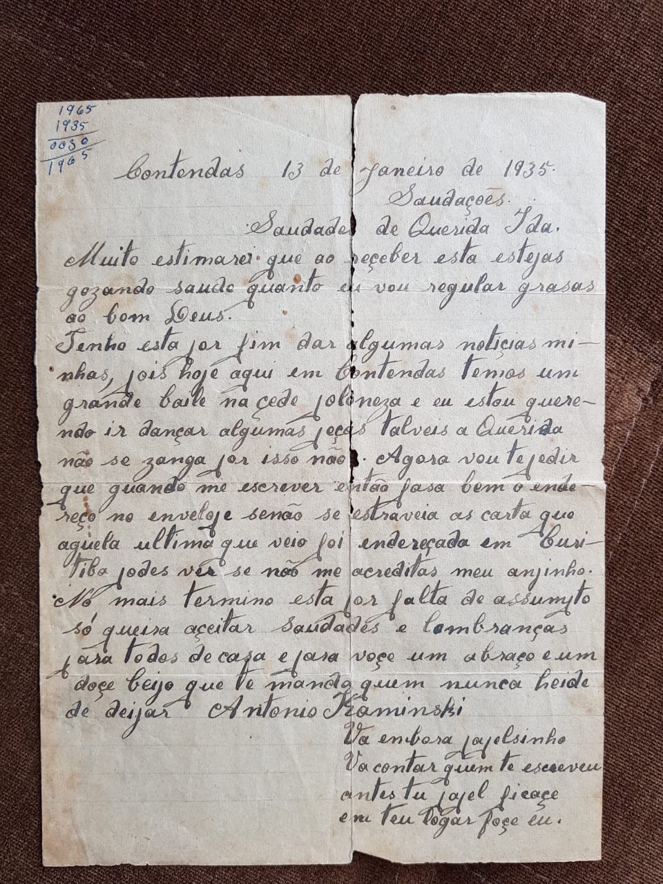 “Contendas, 13 de janeiro de 1935. Saudações”...ops, desculpa caros leitores, mas me empolguei ao ver uma carta dos avós da professora Andréa Batista Rosa, a quem já aproveito para agradecer o envio do material.