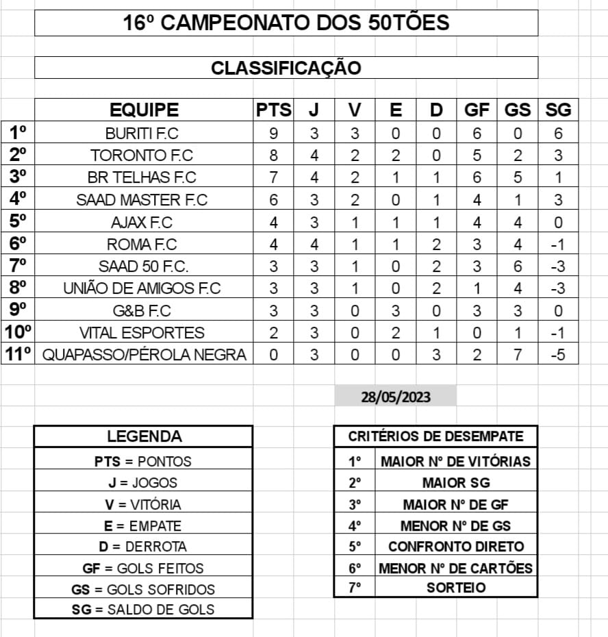 Os jogos da 6ª rodada no sábado (27/05) apontaram, no 1º jogo, às 14h00, BURITI FC 2 x 0 BR TELHAS FC; no 2º jogo, 15h15, AJAX FC 2 x 3 SAAD 50 FC e no 3º jogo, 16h30, TORONTO FC 1 x 1 ROMA FC.