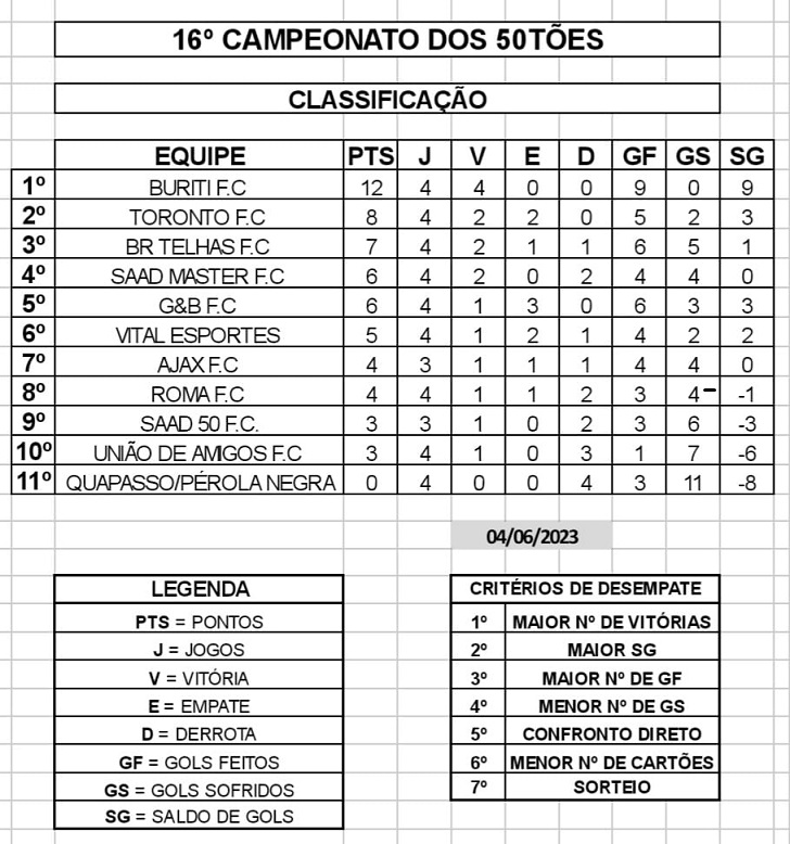 Os jogos da 6ª rodada no sábado (27/05) apontaram, no 1º jogo, às 14h00, BURITI FC 2 x 0 BR TELHAS FC; no 2º jogo, 15h15, AJAX FC 2 x 3 SAAD 50 FC e no 3º jogo, 16h30, TORONTO FC 1 x 1 ROMA FC.