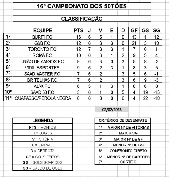 No sábado (08/07), o 50tões apresenta três jogos pela 12ª rodada, onde no 1º jogo, às 13h30, AJAX FC x BR TELHAS; no 2º jogo, 14h45, QUAPASSO/PERÓLA NEGRA FC x UNIÃO DE AMIGOS e no 3º jogo, 16h00, ROMA FC x VITAL ESPORTES.