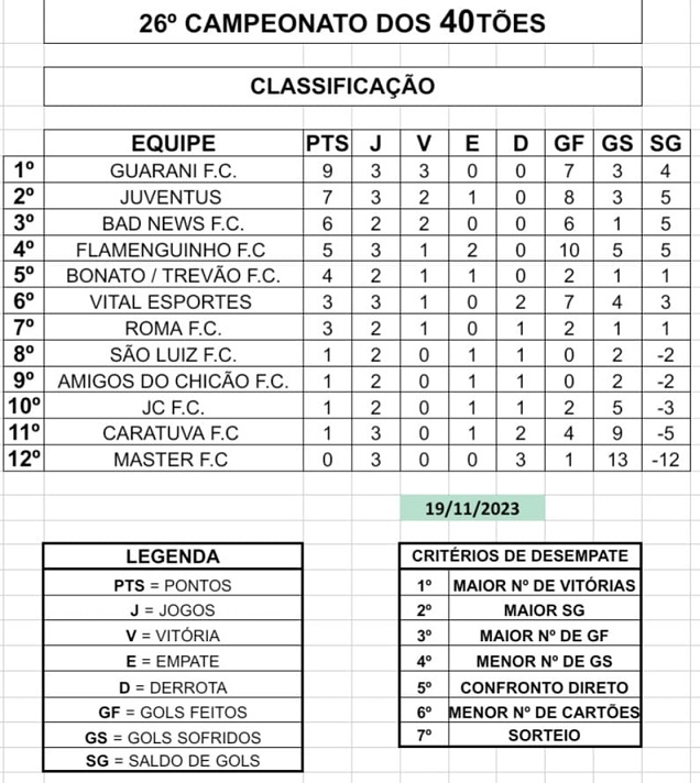A 8ª rodada no domingo (19/11), tem três jogos, às 8h30, CARATUVA 3 x 3 FLAMENGUINHO FC; às 9h45, MASTER FC 1 x 3 GUARANI FC e às 11 horas, JUVENTUS FC 2 x 1 VITAL ESPORTES.