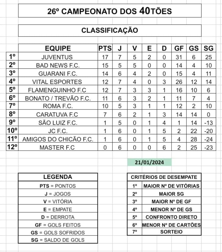 Está prevista para o domingo (28 de janeiro de 2024), a 16ª rodada, com três jogos às 8h30, GUARANI FC x BAD NEWS FC; às 9h45, CARATUVA FC x ROMA FC e às11 horas, MASTER FC x SÃO LUIZ FC.