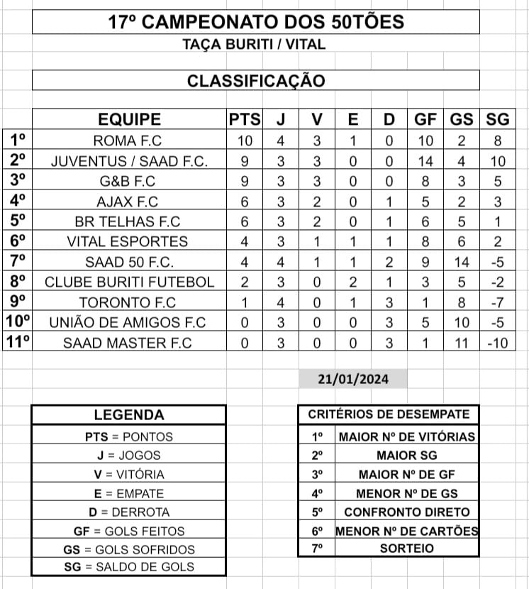 A 7ª rodada do 17º Campeonato 10 Joacir dos 50tões, será realizada no sábado (27/01), com três jogos, no 1º jogo, às 14h00, BR TELHAS x G&B FC; no 2º jogo, 15h15, AJAX FC x JUVENTUS /SAAD FC e 3º jogo, 16h30, SAAD MASTER FC x CLUBE BURITI FUTEBOL.