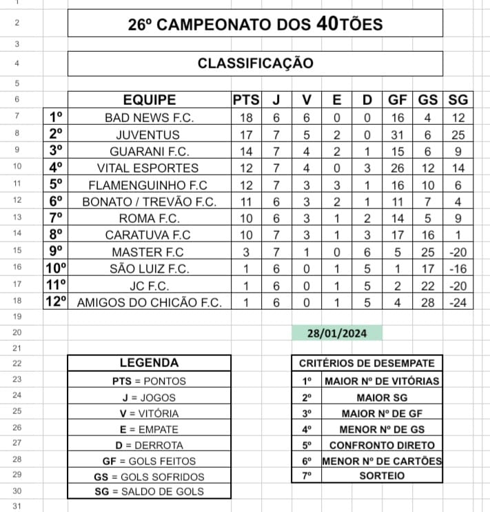No domingo (28 de janeiro de 2024), aconteceu a 16ª rodada, com três jogos às 8h30, GUARANI FC 0 x 2 BAD NEWS FC; às 9h45, CARATUVA FC 3 x 2 ROMA FC e às11 horas, MASTER FC 3 x 0 SÃO LUIZ FC.