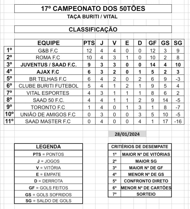 A 7ª rodada do 17º Campeonato 10 Joacir dos 50tões, realizada no sábado (27/01), apresentou três jogos, no 1º jogo, às 14h00, BR TELHAS 0 x 4 G&B FC; no 2º jogo, 15h15, AJAX FC 1 x 1 JUVENTUS /SAAD FC (Com recurso em análise) e 3º jogo, 16h30, SAAD MASTER FC 0 x 6 CLUBE BURITI FUTEBOL.