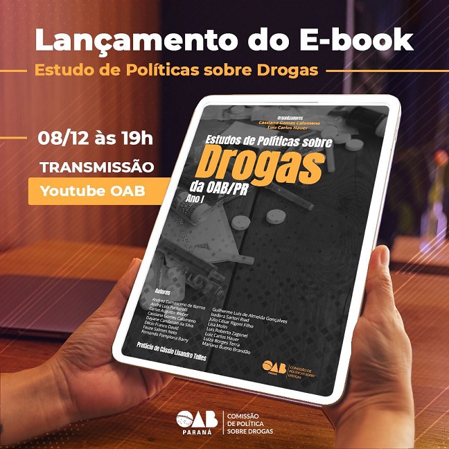 No dia 08/12, quarta-feira, com início às 19h, será transmitido através do Youtube da OAB o lançamento do e-book Estudo de Políticas sobre Drogas da OAB/PR - Ano I. Toda a população está convidada a acompanhar o evento virtual, divulgado pela Comissão de Política sobre Drogas da OAB/PR.
