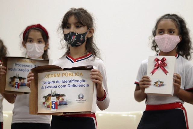 Na sequência, ações foram apresentadas aos munícipes, com caixas de presentes que estudantes levaram até o palco. Entre as ações: