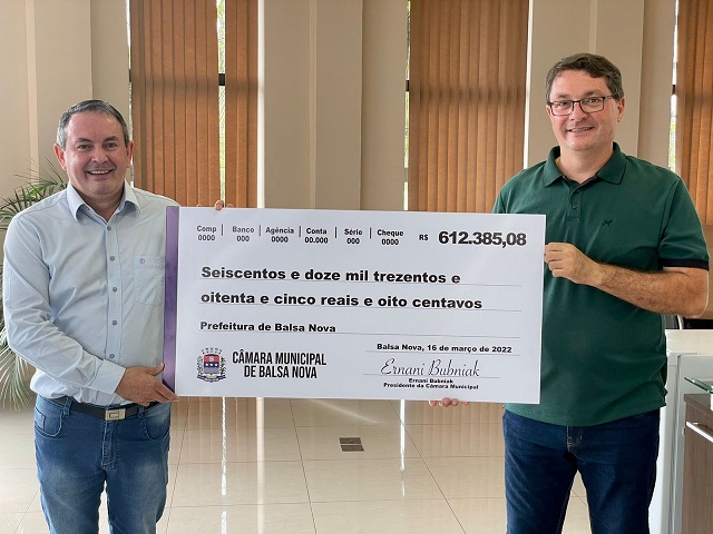 O Poder Legislativo de Balsa Nova devolveu, através do seu representante, o Presidente da Câmara Vereador Ernani Bubiniak, a quantia de R$ 612.385,08 ao Poder Executivo, representado pelo Prefeito Marcos Zanetti.