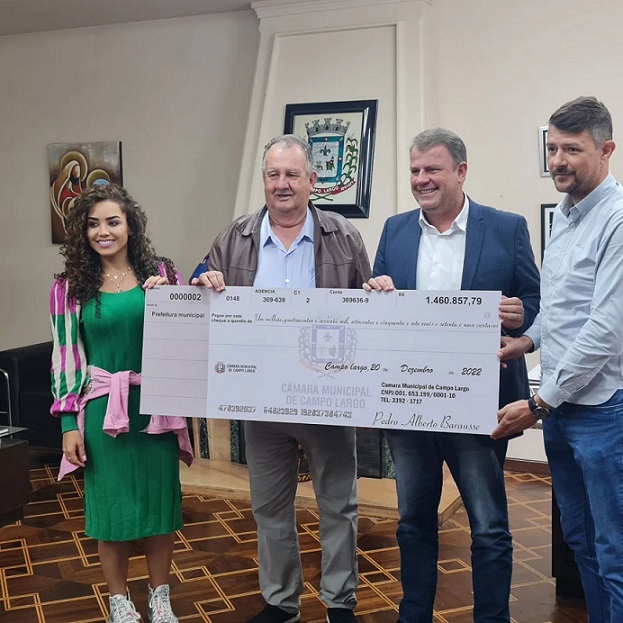 Na manhã da quinta-feira, 22 de dezembro, o Presidente da Câmara de Vereadores de Campo Largo, vereador Pedrinho Barausse, juntamente, com a vereadora secretária Cléa Oliveira e o vereador 2º vice presidente Luiz Scervenski realizaram a entrega do cheque de R$ 1.460.870.79, ao Prefeito do município, Maurício Rivabem que são sobras do exercício financeiro de 2022 e que por lei devem ser devolvidos aos cofres municipais.