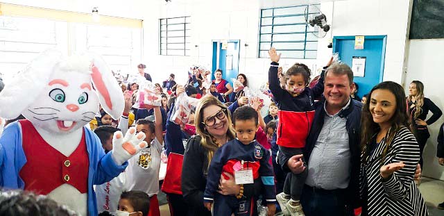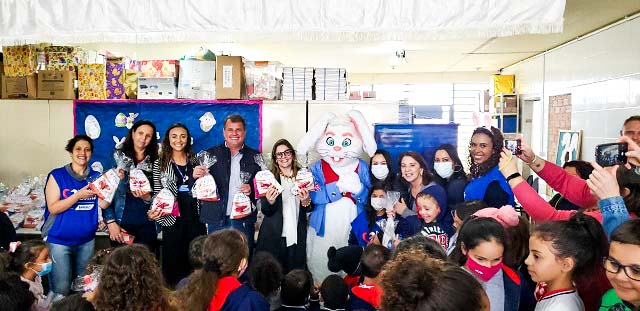 As 400 crianças da Escola Municipal 15 de Outubro, no Jardim Rivabem, de Campo Largo, receberam uma visita do Coelhinho da Páscoa Condor, no dia 12/04, em uma ação realizada pelo Instituto Joanir Zonta, que presenteou os alunos com um kit com chocolate e doces.
