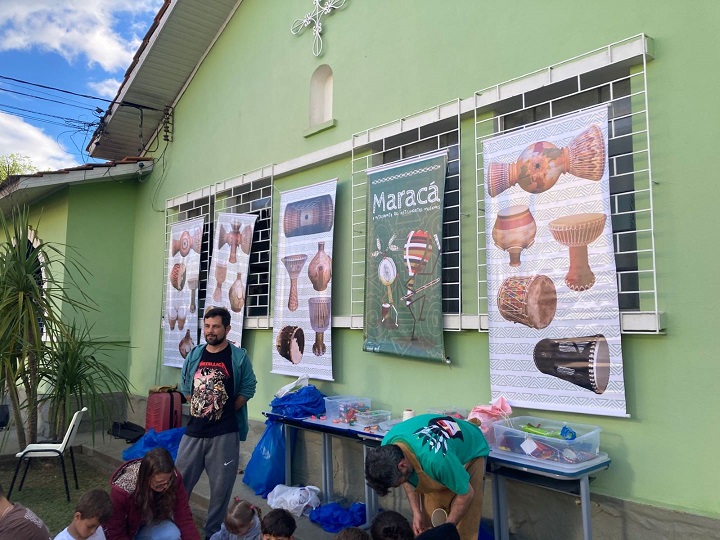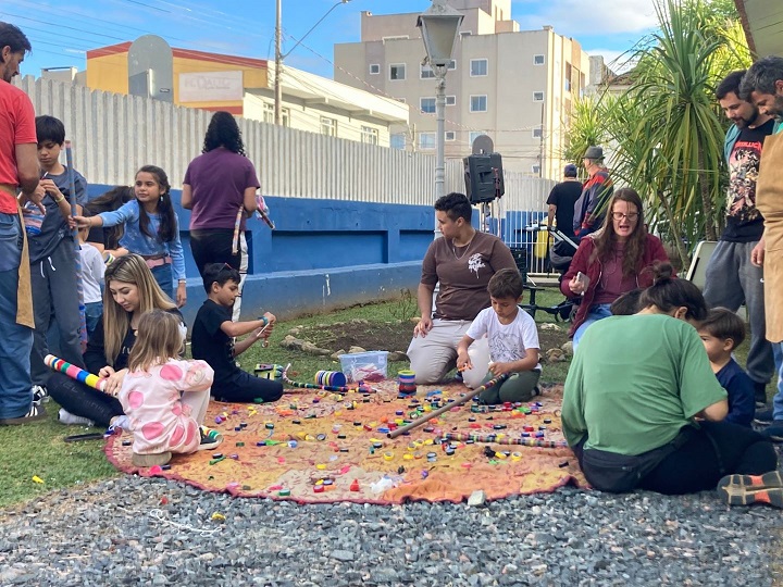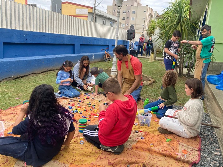 Nestes espaços as crianças puderam participar da oficina de massinhas e do Projeto Maracá que ensina a confeccionar instrumentos como berimbau, tambores e chocalhos usando materiais recicláveis.