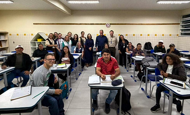Na 2ª feira (02/03), o prefeito Mauricio Rivabem, a vice-prefeita Chrystiane Chemin e o secretário municipal de Educação, Bruno Cézar, participaram de um encontro com alunos da EJA – Educação de Jovens e Adultos, que está com matrículas abertas para pessoas com 15 anos ou mais e que não concluíram o 5º ano. A modalidade de ensino oferece a oportunidade de exercer o direito à educação para pessoas que não completaram o Ensino Fundamental ou Ensino Médio na idade adequada.