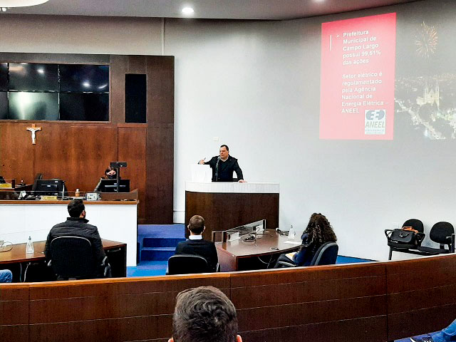 Na manhã de segunda-feira (14/06) os diretores da Companhia Campolarguense de Energia – Cocel apresentaram aos vereadores as principais ações realizadas nos últimos anos e as ações em andamento. O projeto de melhoria na iluminação pública, realizado em parceria com a Prefeitura Municipal, foi um dos destaques. Já são mais de cinco mil luminárias led instaladas e a economia no consumo de energia possibilita a ampliação do projeto. O novo projeto de eficiência energética “Iluminando o Saber” também foi detalhado pelo diretor presidente da Companhia, José Arlindo Lemos Chemin. Este projeto, que está em execução, consiste na substituição de lâmpadas de todas as escolas públicas municipais por modelos led e instalação de painéis fotovoltaicos em cinco escolas e na Vila Olímpica.