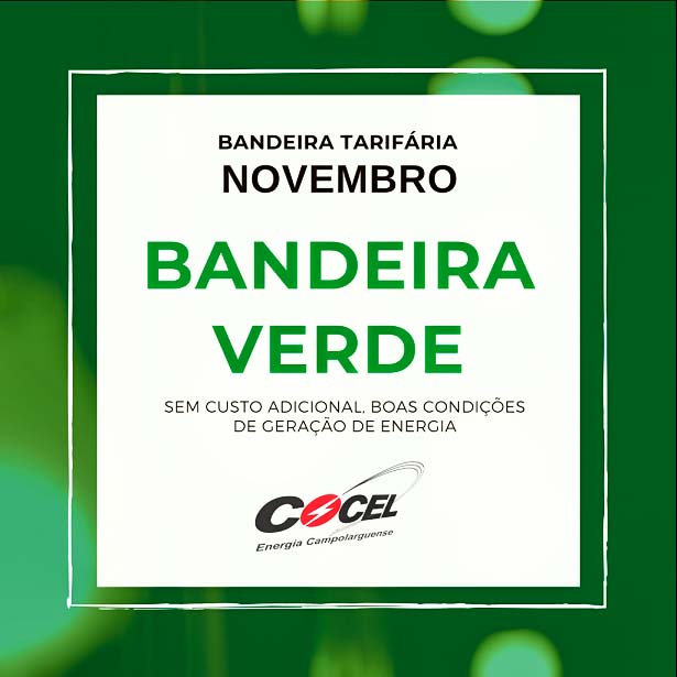 A Agência Nacional de Energia Elétrica – ANEEL mantém o acionamento da bandeira tarifária verde no mês de novembro. Não há cobrança adicional nas tarifas de energia, devido às boas condições de geração.