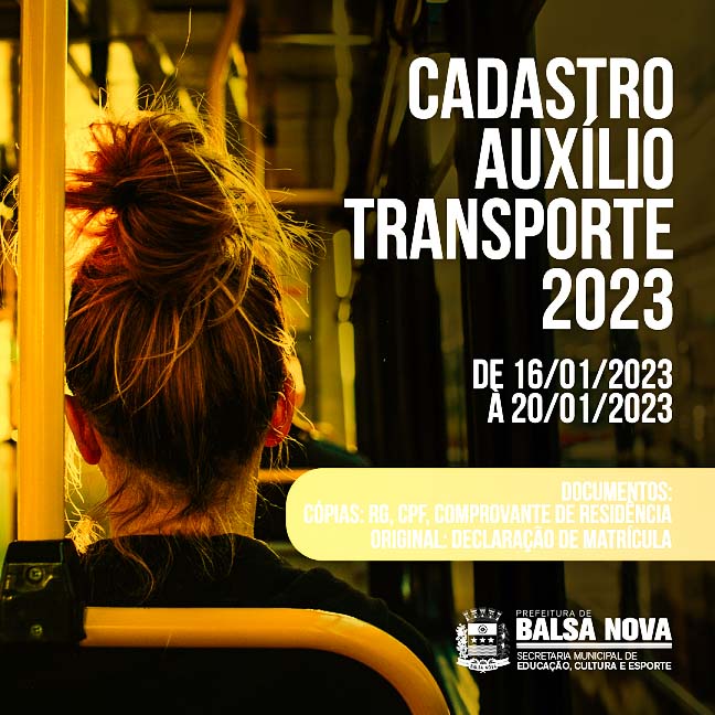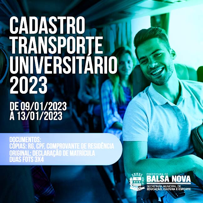 A Secretaria Municipal de Educação de Balsa Nova informa que realizará novos cadastros para alunos do transporte universitário, do dia 09/01/2023 a 13/01/2023. Documentos necessários: