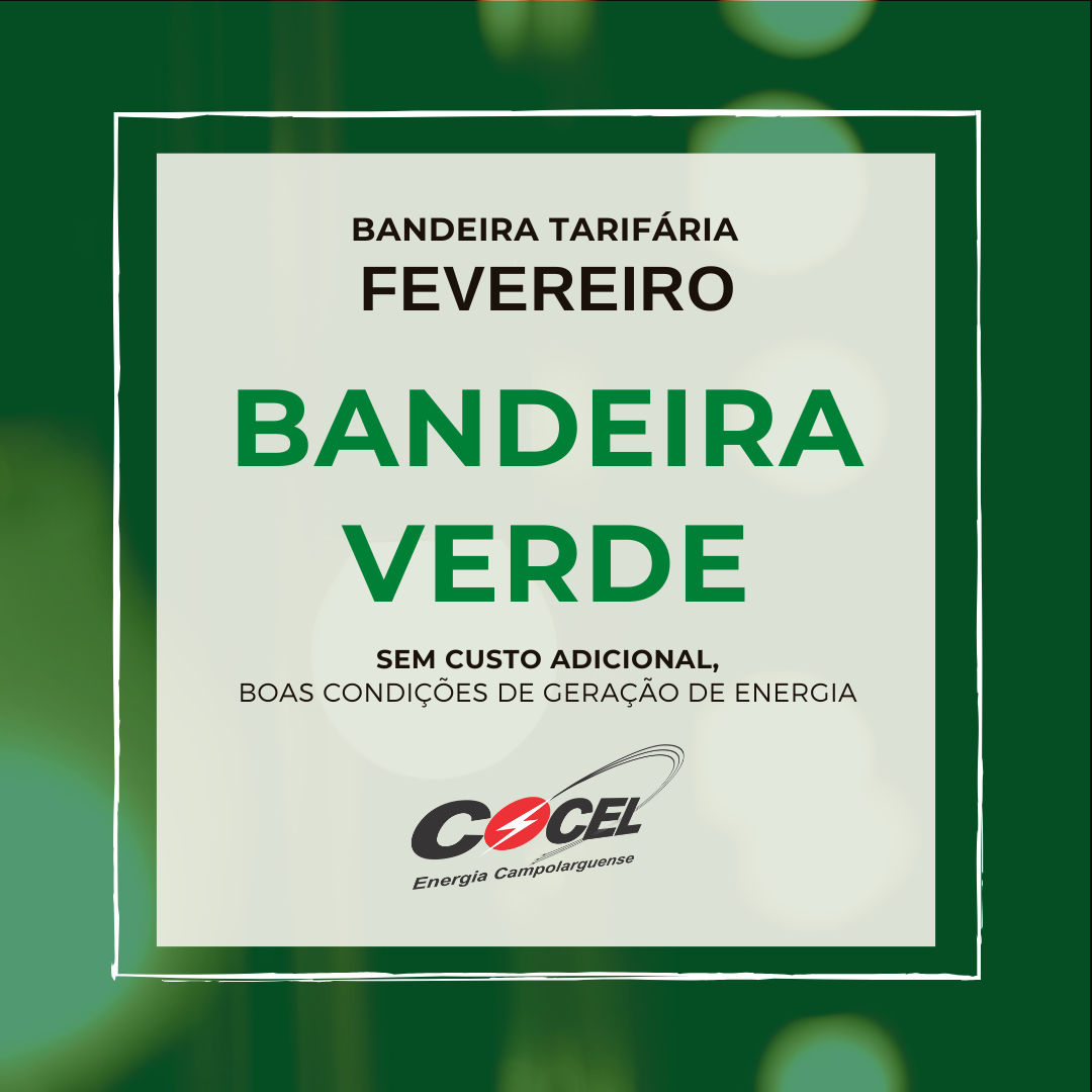 A Agência Nacional de Energia Elétrica – ANEEL mantém o acionamento da bandeira tarifária verde no mês de fevereiro de 2023. Não há cobrança adicional nas tarifas de energia, devido às boas condições de geração. A bandeira verde está vigente desde 16/04/22.