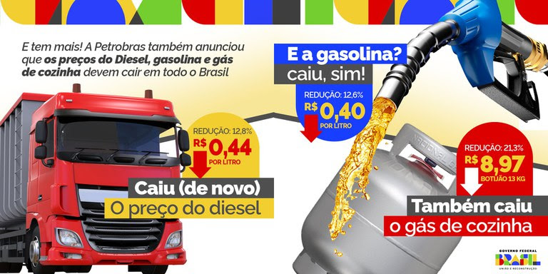 O fornecimento de gasolina, diesel e gás de cozinha fica mais barato a partir desta quarta-feira, 17/5, em todo o país. A Petrobras anunciou a mudança da política de preços e a queda nos valores praticados pela empresa. O novo modelo maximiza vantagens que a Petrobras tem a nosso favor, sem se afastar da referência internacional de preços. Abrasileirar significa levar nossas vantagens em conta sem tirar o Brasil do contexto internacional. Preservar o resultado econômico alto e não descer a rentabilidade. Faremos o melhor preço dentro de nossas possibilidades, usando para esse efeito a autossuficiência conquistada em anos e anos. (Jean Paul Prates, presidente da Petrobras).