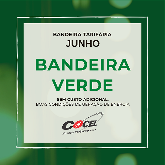 A Agência Nacional de Energia Elétrica – ANEEL mantém o acionamento da bandeira tarifária verde no mês de junho de 2023. Não há cobrança adicional nas tarifas de energia, devido às boas condições de geração. A bandeira verde está vigente desde 16/04/22, sendo o maior período de acionamento consecutivo de uma mesma bandeira.