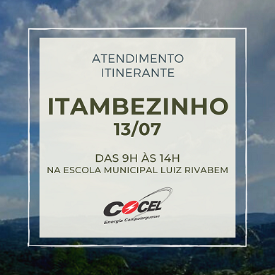 A comunidade do Itambezinho, em Campo Largo, receberá o atendimento itinerante das equipes da Companhia Campolarguense de Energia – Cocel e da Secretaria Municipal de Desenvolvimento Social – SMDS, no dia 13/07 (quinta-feira). Os moradores da região podem solicitar serviços como cadastros e recadastros na Tarifa Social, mudanças de titularidade, parcelamentos, ligações novas, manutenção da iluminação pública, entre outros. O atendimento será na Escola Municipal Luiz Rivabem, das 9h às 14h.