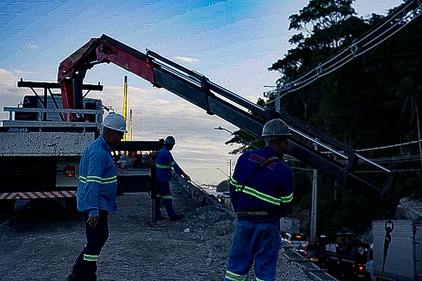 Outra frente que ganhou ritmo nesta fase é a implantação dos sistemas de iluminação. Além da estrutura padrão de postes e luminárias, que já passou por testes, o consórcio responsável iniciou a instalação da iluminação cênica dos estais, que vai valorizar a ponte no período noturno.
