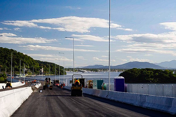 A poucos dias da inauguração, marcada para 29 de abril, as obras da Ponte de Guaratuba avançam com a conclusão de etapas importantes da estrutura e dos acessos. No dia 09/04, foi finalizada a aplicação da última camada de asfalto sobre o tabuleiro da ponte, o que significa que toda a estrutura sobre a baía já conta com pavimentação.