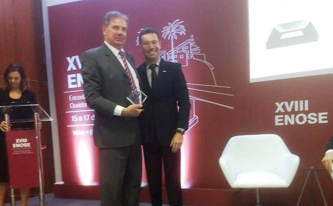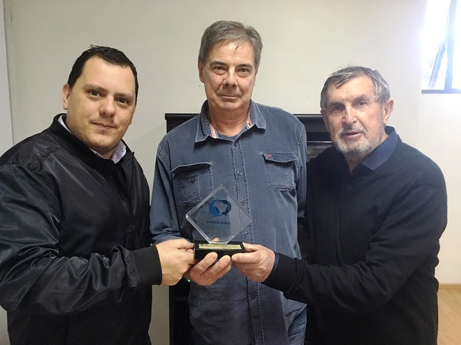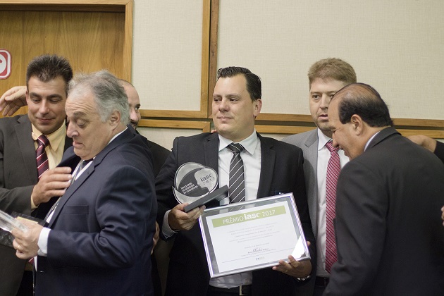 O Ouvidor da Cocel, Claus Vana, recebendo troféu do Prêmio ANEEL de Ouvidoria em 2019.