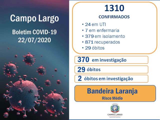 Campo Largo está sob grau de risco médio com acionamento da “bandeira laranja”. Para definição da bandeira são ponderados inúmeros critérios, como o número de novos casos confirmados, óbitos, ocupação de leitos clínicos (enfermarias) e de Unidades de Terapia Intensiva (UTIs), taxa de transmissão, entre outros indicadores.