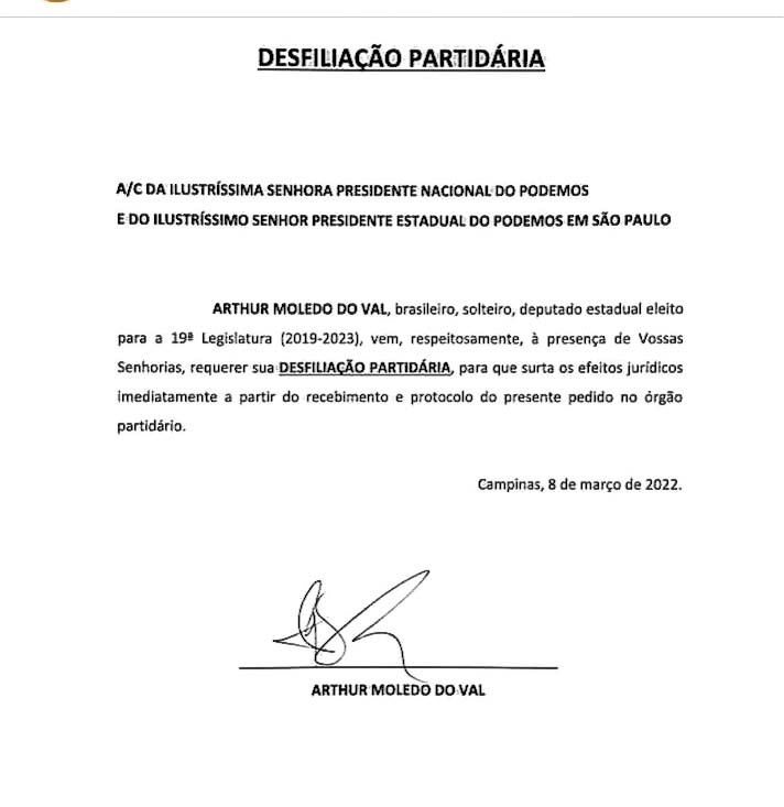Numa primeira decisão, o partido PODEMOS adotou a medida de encaminhar a “Expulsão” do deputado Arthur do Val de suas fileiras. Não se consumou o fato, pois o parlamentar pediu desfiliação antes do procedimento interno ser consumado.