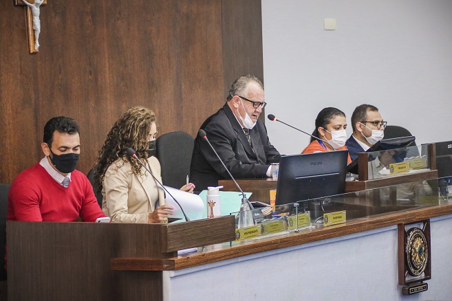 A primeira sessão ordinária do mês de abril da Câmara Municipal de Campo Largo aconteceu, na segunda-feira (04/04), com início às 15 horas, no Plenário Alberto Klemes, tendo como presidente o vereador Pedro Barausse, como secretária a vereadora Cléa Oliveira e vice-presidente, vereador Genésio da Vital, na mesa diretora. A reunião seguiu as determinações sanitárias e observando as normas do regimento interno do Legislativo Municipal.