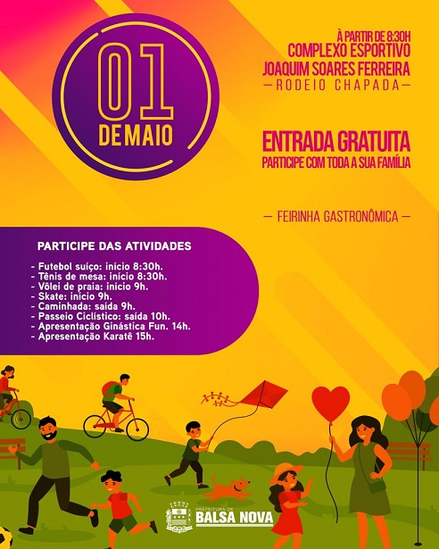 No domingo, dia 01 de maio, Prefeitura de Balsa Nova realizará uma grande festa em comemoração ao Dia do Trabalhador. A festa acontecerá no Rodeio Chapada (Complexo Esportivo Joaquim Soares Ferreira), a partir das 8h30 e contará com várias atividades esportivas, brinquedos para as crianças e muita diversão em família. A Feirinha Gastronômica, também, estará presente. Será promovida uma Caminhada, com saída às 9 horas da Praça 25 de janeiro e também, um Passeio ciclístico com saída às 10 horas, da Praça 25 de janeiro. As duas atividades terão como destino o Complexo Esportivo do Rodeio Chapada. Além das duas atividades, acontecem Torneios de Futebol Suíço, de Tênis de Mesa, de Vôlei de Praia e de Skate. As festividades contarão, também, com Apresentação de Ginástica Funcional e Apresentação de Karatê.