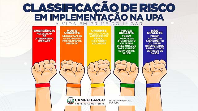 Campo Largo vive um aumento exponencial da demanda nos atendimentos da Unidade de Pronto Atendimento (UPA), desde o início do outono. Muitos pacientes que estão no aguardo não entendem como funcionam os critérios para atendimento, especialmente nos casos de urgência. Assim, a Prefeitura de Campo Largo, por meio da Secretaria Municipal de Saúde, implementa na UPA, a partir de junho, gradativamente, um protocolo criado pelo Ministério da Saúde e utilizado por todo o Sistema Único de Saúde (SUS), chamado Classificação de Risco.