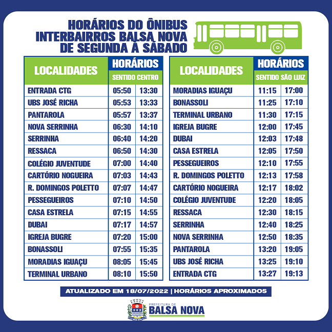 Assim, a Linha de ônibus passou a ter mais três quilômetros na rota anteriormente estabelecida. Com a alteração realizada, os horários precisaram ser adequados para atender a nova demanda. A administração municipal de Balsa Nova adianta que as alterações são comuns quanto se oferece um novo serviço à população.