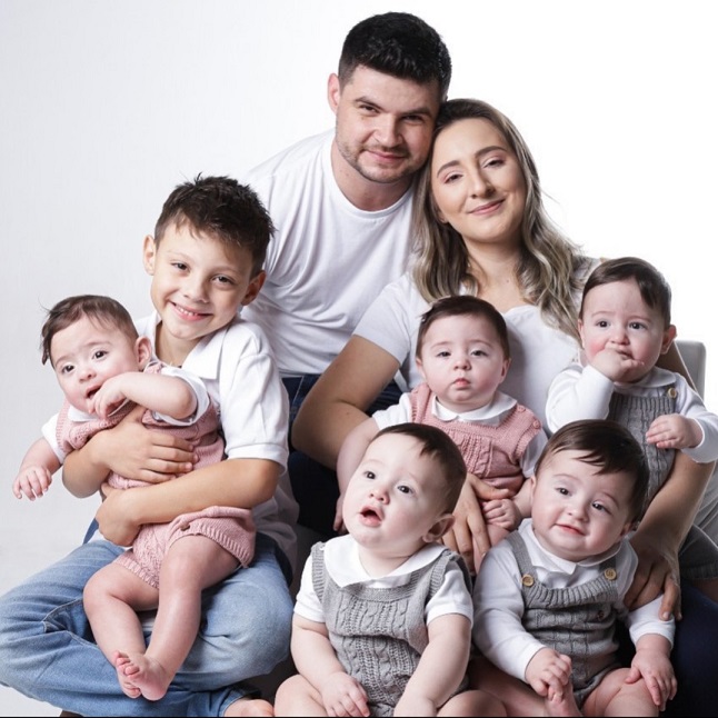 “Com a descoberta da minha gestação de cinco bebês, foi algo mágico, instantaneamente senti algo dentro de mim que tomou conta totalmente e, ao mesmo tempo foi assustador e repleto de incertezas, a única certeza é que não faltaria amor (...). Eu e o Luis lutamos muito por eles, sou uma pessoa que tento sempre passar positividade e leveza. Vivemos muitas dificuldades em Campo Largo, foi desafiador demais, o período da UTI foi muito difícil também, mas passaríamos tudo novamente (...). Sou muito grata e escolhida por Deus para esta linda missão”, publicou a mãe Anieli na página “Quíntuplos do Paraná”, na rede social Instagram. Fotos: reprodução/Instagram.