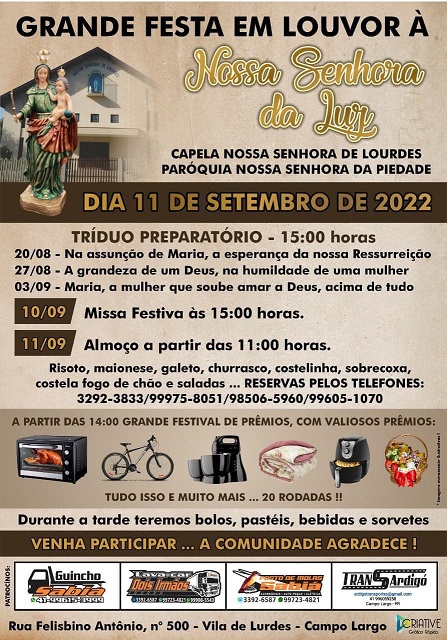 Com muita fé e devoção, os fiéis católicos campo-larguenses celebrarão a festa em louvor a Nossa Senhora da Luz. Conforme divulgado pela Paróquia Nossa Senhora da Piedade, a missa festiva será realizada na Capela Nossa Senhora de Lourdes, no dia 10/09 (sábado), às 15h.