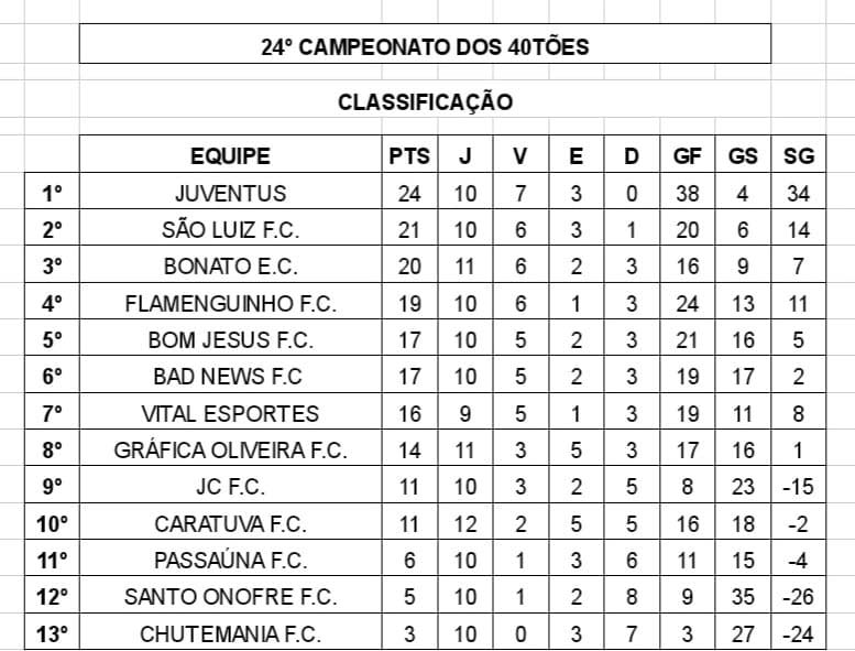 Na manhã de domingo, 04 /12, também, prossegue o campeonato na categoria 40tões, com quatro jogos, pela 14ª rodada.