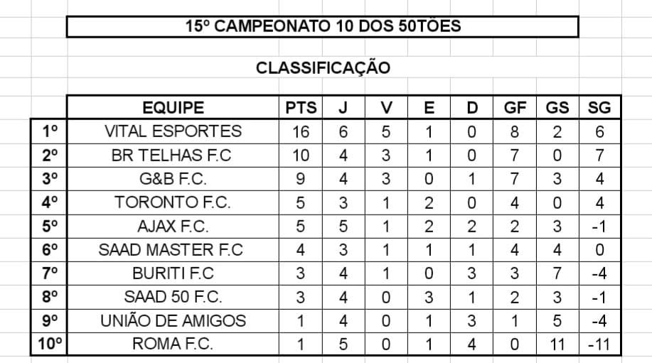 A classificação aponta a liderança invicta do Vital Seg, com 16 pontos, com cinco vitórias e um empate; na segunda posição está o BR TELHAS FC com 10 pontos, também, invicto, só que com menos jogos realizados, sendo três vitórias e um empate. A tabela de jogos segue conforme a divulgação feita pelos organizadores.