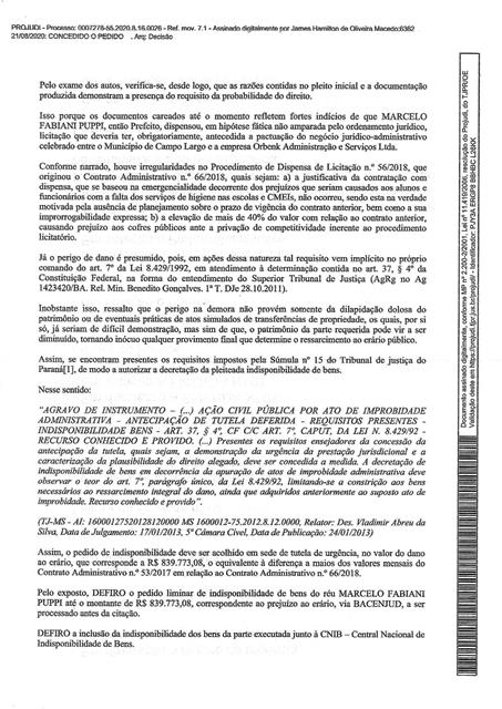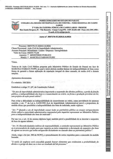 Uma liminar da Justiça, deferida pelo juiz de direito James Hamilton de Oliveira Macedo, no final do mês de agosto de 2020, determinou a indisponibilidade de bens do prefeito Marcelo Fabiani Puppi, em virtude de irregularidades em contrato e de prejuízo ao erário público do município de Campo Largo. O montante de R$ 839 773,08 é o valor equivalente à diferença a mais dos valores de dois contratos administrativos para prestação serviços em escolas do município. A gestão municipal do prefeito Marcelo Puppi, com dispensa de licitação, contratou em caráter emergencial a empresa Orbenk, com um sobre preço de mais de 40% (quarenta por cento), em relação ao contrato da empresa anterior. A liminar foi concedida ao Ministério Público, provocada por Ação Civil Pública e o magistrado ressaltou que “O perigo na demora não provém somente da dilapidação dolosa do patrimônio ou de eventuais práticas de atos simulados e transferências de propriedade, os quais, por si só, já seriam de difícil demonstração, mas sim de que, o patrimônio da parte requerida pode vir a ser diminuído, tornando inócuo qualquer provimento final que determine o ressarcimento ao erário público.” A decisão judicial teve por base dois pontos de irregularidades na Dispensa de Licitação nº 56/2018 que deu origem ao contrato administrativo nº 66/2018, ou seja, 1) A justificativa da contratação com dispensa que se baseou a emergencialidade decorrente dos prejuízos que seriam causados aos alunos e funcionários com falta dos serviços de higiene nas escolas e CMEI’s, não ocorreu, sendo esta na verdade motivada pela ausência de planejamento sobre o prazo de vigência do contrato anterior, bem como a sua improrrogabilidade expressa; 2) A elevação a mais de 40% (quarenta por cento) do valor com relação ao contrato anterior, causando prejuízo aos cofres públicos ante a privação de competividade inerente ao procedimento licitatório. Cabe ao Município de Campo Largo a se manifestar como parte integrante do processo com a solicitação do devido ressarcimento aos cofres públicos. A promotora do Ministério Público do PR, Mariana Andriola, em entrevista a Radio Jovem Pan, declarou que “a emergencialidade, alegada pela administração municipal, ela não restou caracterizada, pois se tratava de serviços de natureza continuada e habitual, cujo contrato anterior firmado com outra empresa por meio de licitação, já previa a impossibilidade de prorrogação contratual, ou seja, a situação de emergência alegada era plenamente previsível. Não bastasse isso, o contrato firmado com a empresa Orbenk, implicou no sobre preço de 43% (quarenta e três por cento) se comparado com o preço praticado com a empresa anterior.” Constada a irregularidade, o município de Campo Largo, também, poderá acionar o prefeito Marcelo Puppi para que o devido ressarcimento dos valores pagos a mais conforme o demonstrado no processo.
