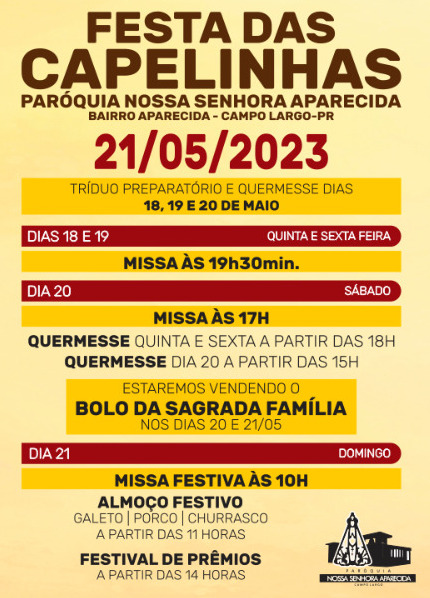 A Paróquia Nossa Senhora Aparecida, em Campo Largo, promove no domingo (21/05) a tradicional Festa das Capelinhas. A confraternização costuma reunir centenas de pessoas e a expectativa é que neste ano o evento reúna novamente grande público.