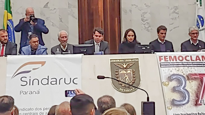 O deputado estadual Alexandre Curi presidiu a sessão solene comemorativa aos 37 anos de fundação da FEMOCLAM. A proposição da homenagem tem autoria dos deputados Alexandre Curi e Maria Vitória e na sessão fizeram a entrega a mais de 1200 dirigentes comunitários e autoridades de Curitiba e Região Metropolitana. Os dirigentes da Femoclam, Nilson Pereira e João Fereira foram parabenizados pela condução da entidade ao longo das últimas décadas.