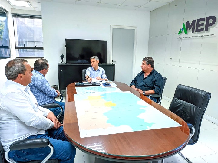 O prefeito de Balsa Nova, Marcos Zanetti; com o Secretário Municipal de Administração, Itaboraí Cordeiro e o Presidente da Câmara Municipal, Nélio Chiquito, estiveram na sede da Amep, em reunião com o presidente Gilson Santos sobre o Plano de Desenvolvimento Urbano Integrado – PDUI.