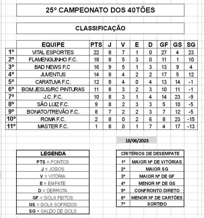VITAL ESPORTES lidera o 25º Campeonato dos 40tões