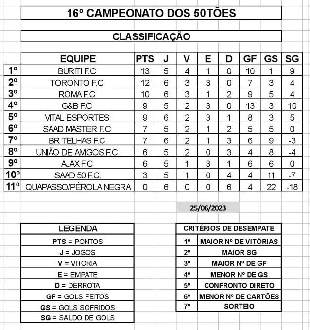 No sábado (01/07) estão previstos três jogos pela 10ª rodada, no 1º jogo, às 13h30, SAAD Master FC x UNIÃO DE AMIGOS FC ; no 2º jogo, 14h45, SAAD 50 FC x G&B FC e no 3º jogo, 16h00, BURITI FC x TORONTO FC.