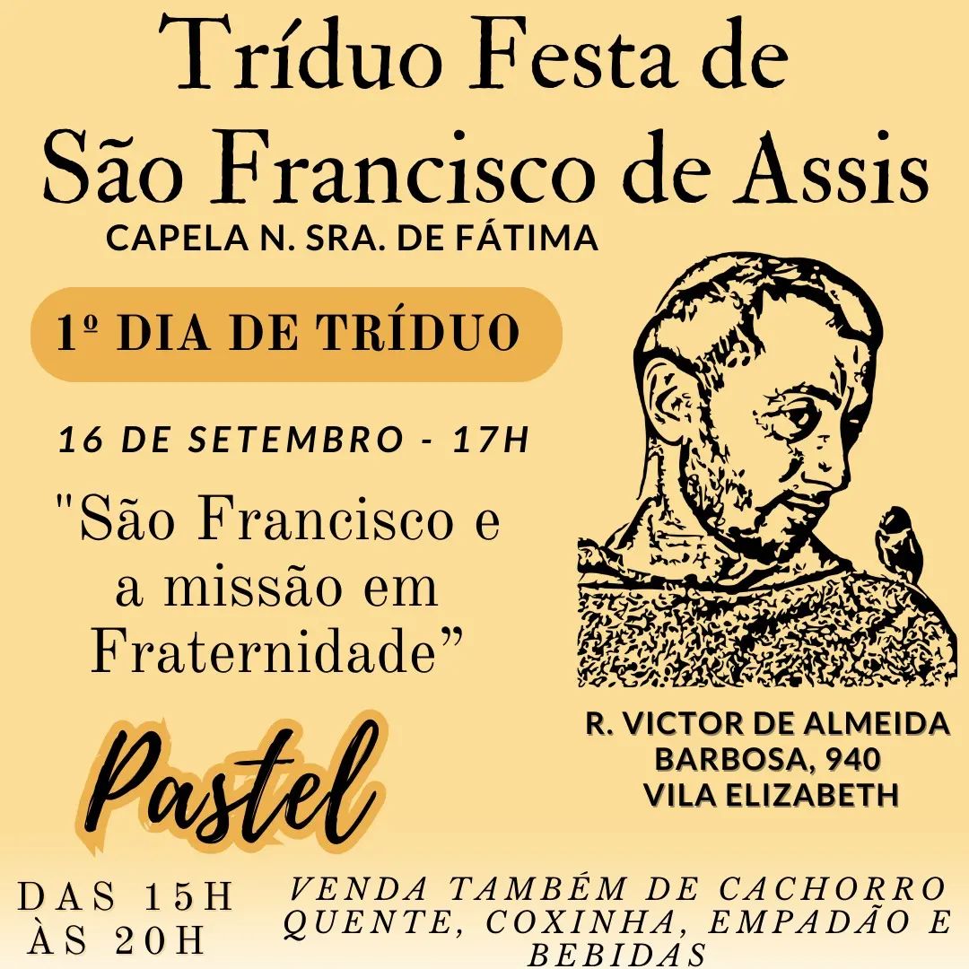 Com o tema “São Francisco e a missão em Fraternidade”, a Capela Nossa Senhora de Fátima realiza no dia 16/09, às 17h, o primeiro tríduo em preparação à festa de São Francisco de Assis. Nos dias de tríduo, das 15h às 20h, haverá quermesse com o tradicional pastel da comunidade, além de cachorro quente, coxinha, empadão e bebidas.