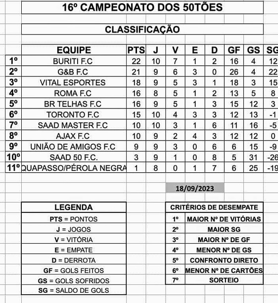 A 18ª rodada adiada no 16º Campeonato 10 Joacir dos 50tões, acontece no sábado (23/09), com dois jogos, no 1º jogo, às 13h30, ROMA FC X G&B FC; no 2º jogo, 14h45, QUAPASSO/PÉROLA NEGRA FC X SAAD 50 FC.