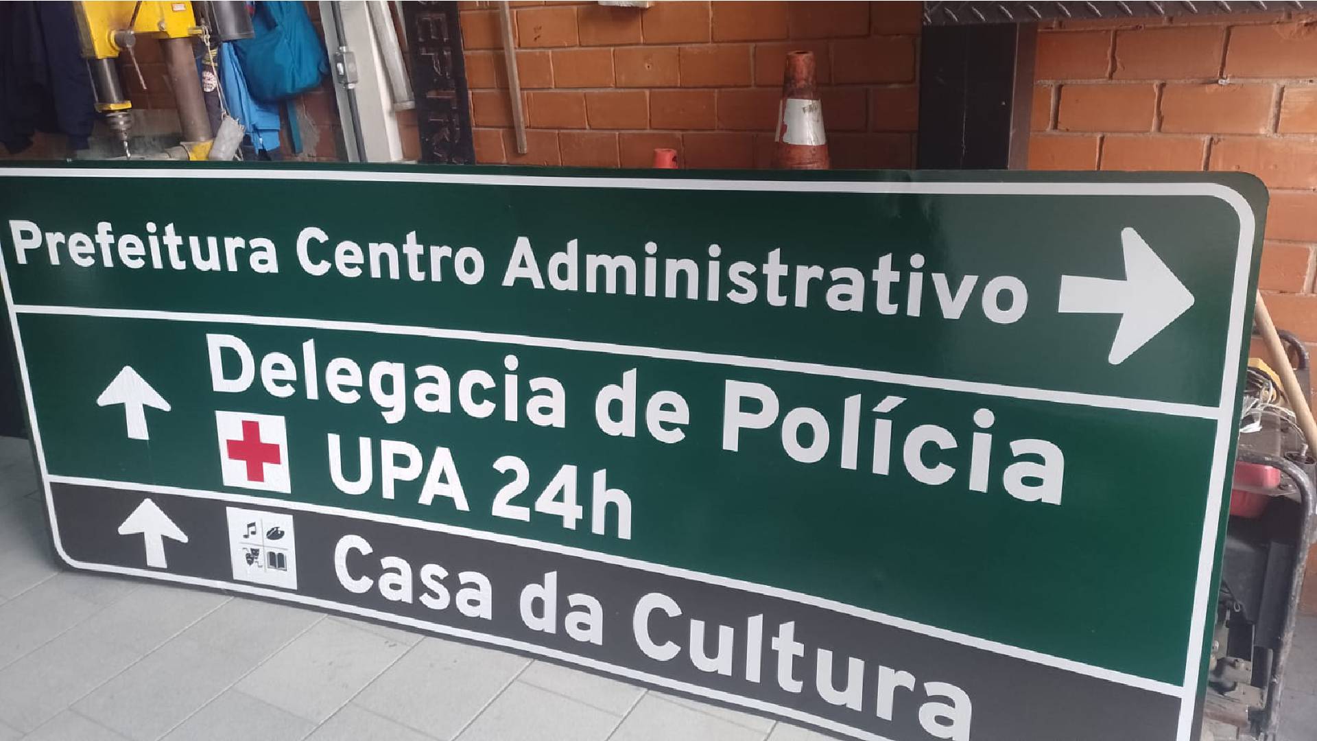 As placas indicam bairros, avenidas e pontos estratégicos do município, para que os motoristas e pedestres se localizem de maneira ágil e segura.