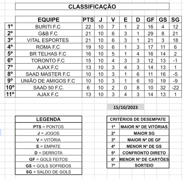 A 2ª fase, no sábado (21/10), tem três jogos, no 1º jogo, às 13h30, G&B FC X AJAX FC; no 2º jogo, 14h45, VITAL ESPORTES X TORONTO FC e 3º jogo, 16h, VITAL ESPORTES X BR TELHAS FC.