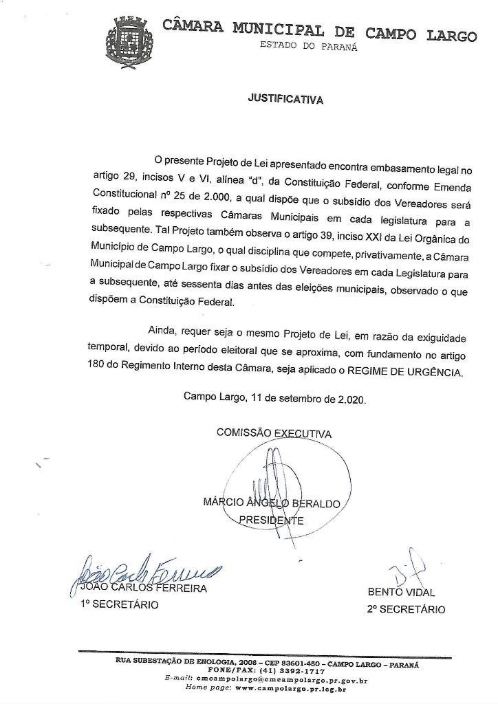 O cidadão campo-larguense já sabe o quanto o prefeito, o vice-prefeito, os secretários municipais e os vereadores, inclusive o futuro presidente da câmara, receberão a partir de janeiro de 2021. Através do projeto de lei nº 72/2020, aprovado por unanimidade, pelos atuais vereadores foram fixados os subsídios para o poder executivo e para o poder legislativo, conforme o que determina a Constituição Federal e a Lei Orgânica do Município. “Isto é coisa de lei e nós, os atuais vereadores temos obrigação de cumprir a Constituição e assim é feito no final de cada quatro anos”, destaca o vereador João D’Água, secretário da Câmara Municipal. Já, o presidente vereador Márcio Beraldo ressalta que é erro grave divulgar que houve aumento de subsídios para o prefeito, para o vice-prefeito, para os vereadores e para os secretários. Isto confunde a população neste momento de eleição municipal. Nós, vereadores, só cumprimos o que é determinado pelas leis. Não podemos ir contra a Constituição Federal. O vereador Darci Andreassa, eleito para nove mandatos e atual vice-presidente, declara que existem pessoas maldosas, neste momento, que procuram deturpar as decisões obrigatórias da Câmara Municipal. Para esclarecer aos mal informados, o que foi aprovado é o mesmo valor estabelecido, em 2016, apenas com a correção inflacionária. Nada mais justo que assim se proceda e se garanta em lei as decisões que são atribuições de todas as câmaras de todos os municípios do Brasil. Em nota de esclarecimento, a Câmara Municipal de Campo Largo notificou a população que o Tribunal de Contas do Estado é o órgão de controle e fiscalização que determina que em todo término de gestão se cumpra a determinação legal de criar este projeto de fixação de subsídios (salário dos vereadores), mas em nenhum momento foi levado a plenário para votação um projeto de aumento de salários. Para uma simples leitura e compreensão, ler alguns artigos da Lei Orgânica de Campo Largo.